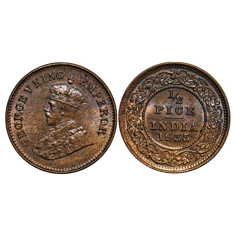George V, Bronze, 1/2 Pice, 1935, Calcutta Mint, No mint mark. F. Prid 768. GK 1221. Brilliant Uncirculated. Scarce.