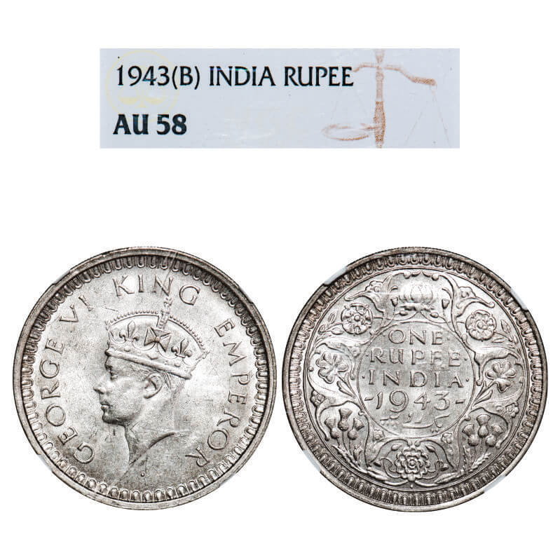 | George VI, Half Silver, Rupee, 1943, Bombay Mint, B(a)/II, Diamond, Security edge, Large 3. F. Prid 241. GK 1266. NGC Slabbed AU 58. Very Scarce. |