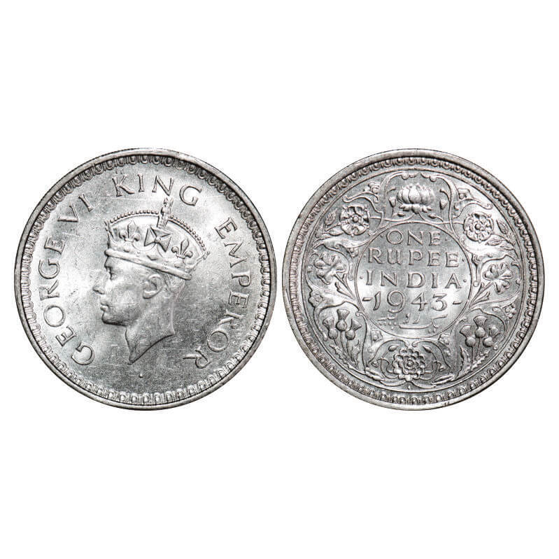 | George VI, Half Silver, Rupee, 1943, Bombay Mint, C/II, Diamond mint mark, Security edge, Small 3, With Diamond shape pyramid on Rev, Ex-Mount above āNā of King. F. Prid 241. GK 1270. Uncirculated. Very Scarce. |