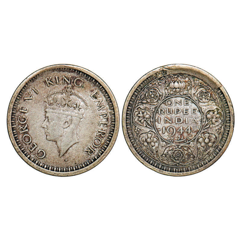 George VI, Half Silver, Rupee, 1944, Bombay Mint, D/II, Dot, Security edge, Cud Error on Rev rim edge. F. Prid 245. GK 1280. Very Fine+. Very Scarce.