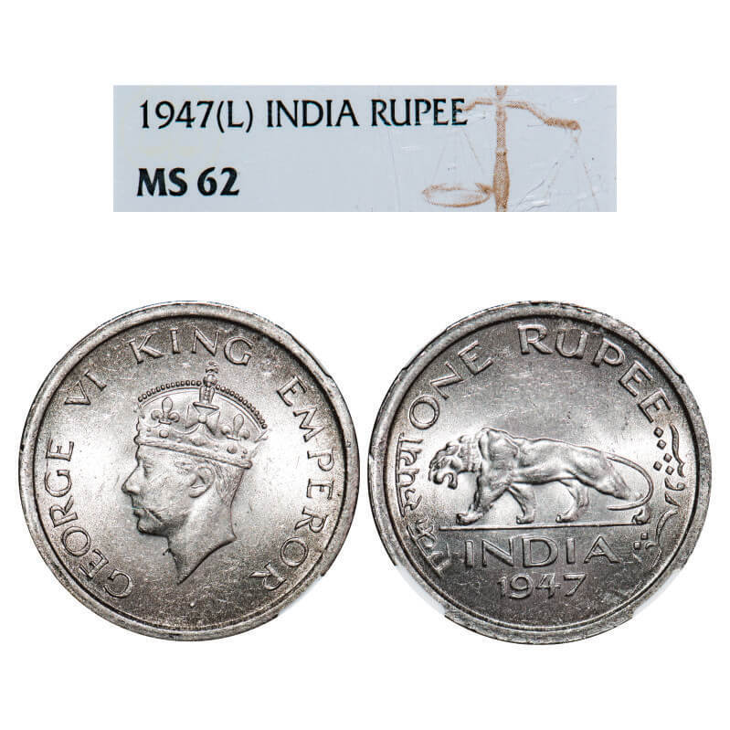 George VI, Nickel, Rupee, 1947, Lahore Mint, E/IV, No mint mark, Security edge. F. Prid 864. GK 1293. NGC Slabbed MS 62. Rare.
