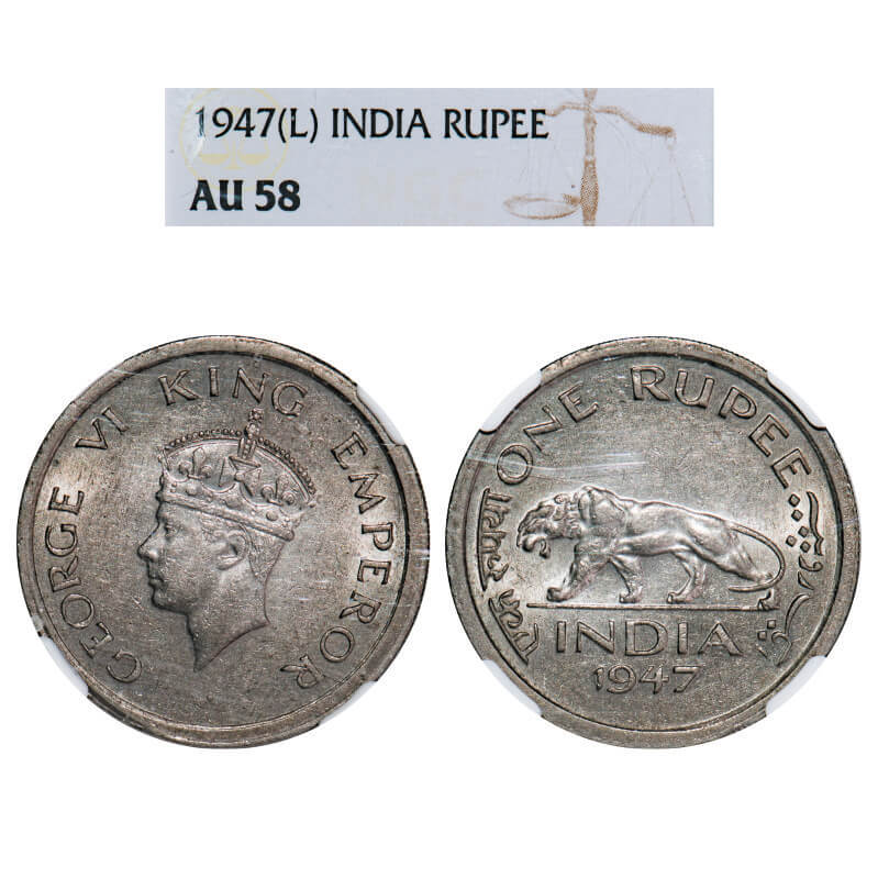 George VI, Nickel, Rupee, 1947, Lahore Mint, E/IV, No mint mark, Security edge. F. Prid 864. GK 1293. NGC Slabbed AU 58. Scarce.