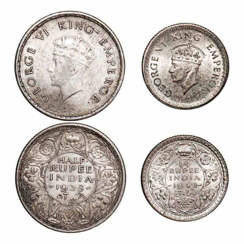 | George VI, Mix metal, (2 coins), 1) Silver, Half Rupee, 1938, Bombay Mint, A/I, Dot, Head Type I, Milled edge, 2) Half Silver, 1/4 Rupee, 1942, Calcutta Mint, Head Type II, Rev II, No dot, Milled edge. F. Prid 351, 474. GK 1294, 1329. Very Fine+ to Brilliant Uncirculated. Scarce. |