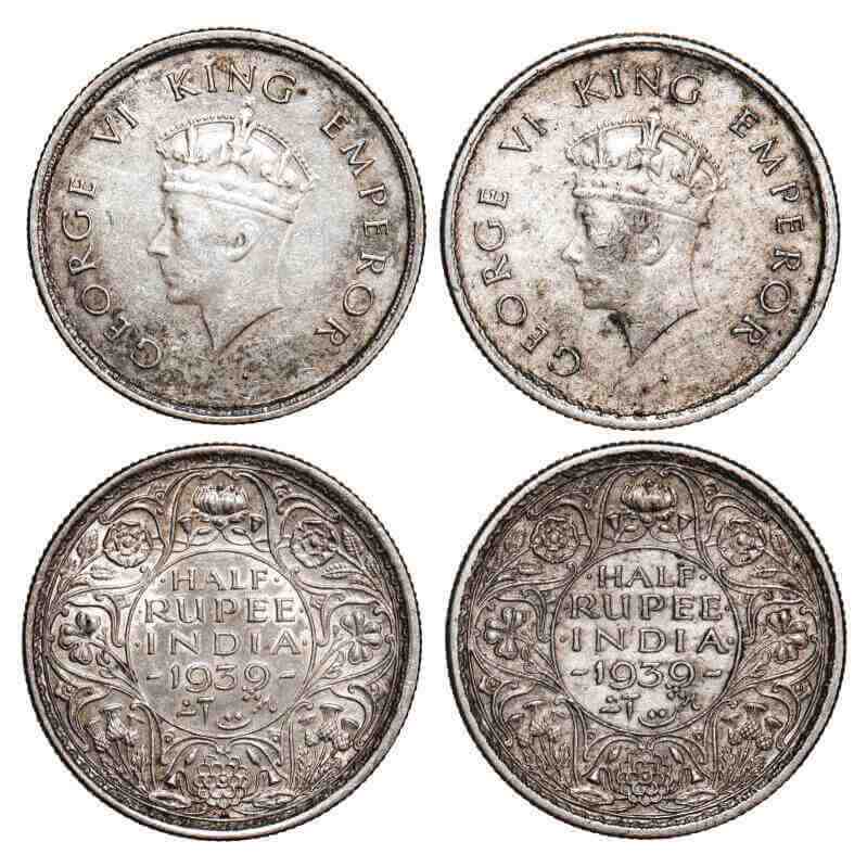 | George VI, Silver, Half Rupee, (2 coins), 1939, 1) Bombay Mint, A/I, Dot, Head Type I, Milled edge, 2) Calcutta Mint, A/I, No dot, Head Type I, Milled edge. F. Prid 352, 363. GK 1295, 1297. Very Fine+ to Extremely Fine. Scarce. |