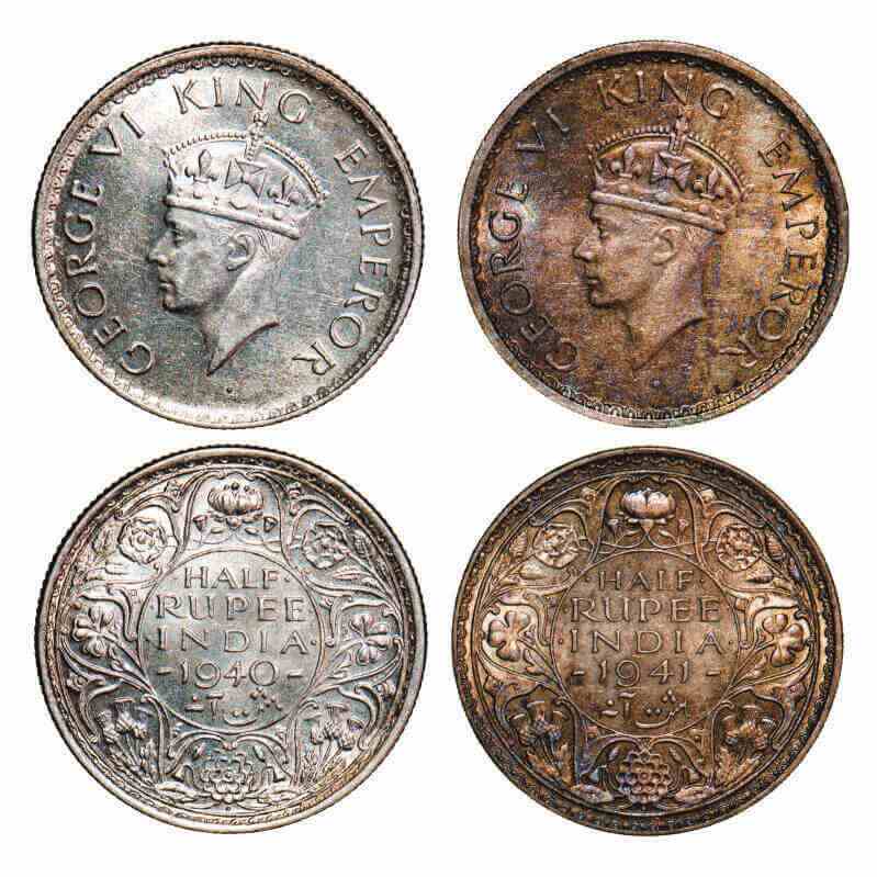 | George VI, Half Silver, Half Rupee, (2 coins), Bombay Mint, Head Type II, Dot, 1) 1940, A(a)/I, Milled edge, 2) 1941, A(a)/I(i), Security edge. F. Prid 354, 355. GK 1299, 1302. Uncirculated, Toned. Scarce. |