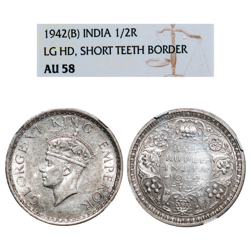 | George VI, Half Silver, Half Rupee, 1942, Bombay Mint, A(a)/II, Dot, Head Type II, Security edge, Die rotation on Rev. F. Prid 356. GK 1303. NGC Slabbed AU 58. Very Scarce. |