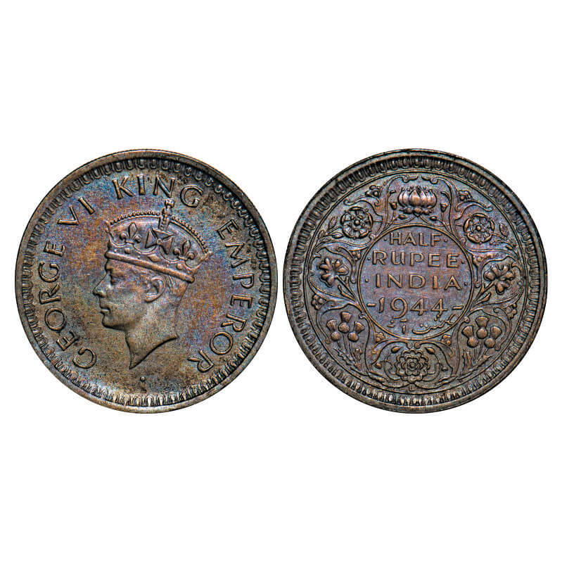 George VI, Half Silver, Half Rupee, 1944, Lahore Mint, B/II, Head Type II, ‘L’ raised, Security edge. F. Prid Unlisted. GK 1314. Brilliant Uncirculated, Rainbow Toned. Very Sacrce.