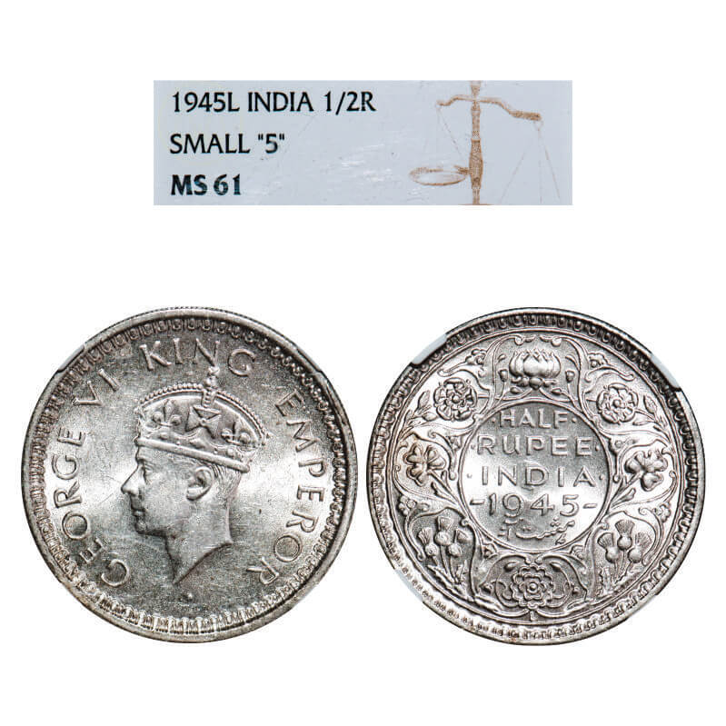 | George VI, Half Silver, Half Rupee, 1945, Lahore Mint, B/II, Head type II, āLā raised, Security edge, Normal 5. F. Prid Unlisted. GK 1319. NGC Slabbed MS 61. Very Scarce. |