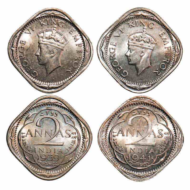 | George VI, Nickel-Brass, 2 Annas, (2 coins), 1939, 1941, Bombay Mint, Head Type I, Dots by year. F. Prid 913. GK 1348, 1355. Mint State. Very Scarce. |