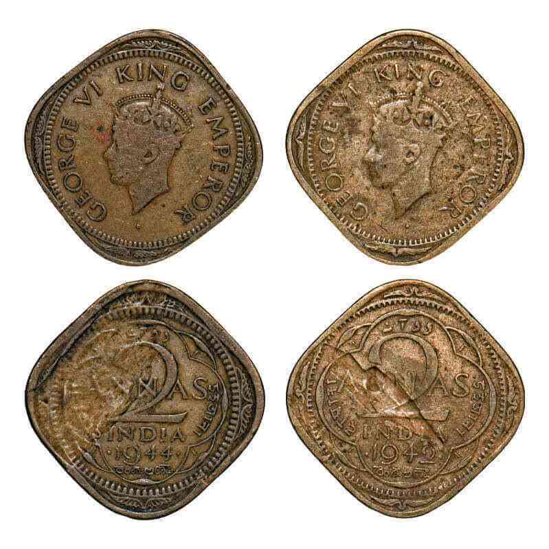 | George VI, Nickel-Brass, 2 Annas, (2 coins), 1) 1942, Bombay Mint, Head Type II, Dots by year, Large numeral 4, 2) 1944, Bombay Mint, Head Type II, Dots by year, Small numerals 44, Planchet flaw on Rev. F. Prid 918, Unlisted. GK 1359, 1364. Very Fine. Scarce. |