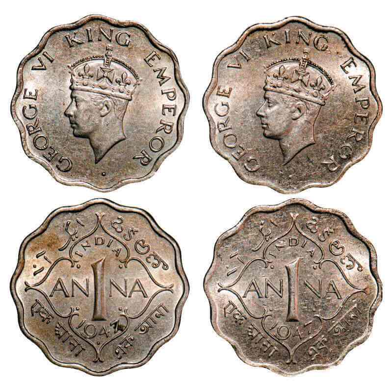 | George VI, Copper-Nickel, 1 Anna, (2 coins), 1947, 1) Bombay Mint, Head Type II, Dot, Tip of crown not touching āNā in King, 2) Calcutta Mint, Head Type II, No dot, Tiny Diamond shaped pyramid on Obv. F. Prid 981, 970. GK 1402, 1403. About Uncirculated to Uncirculated. Scarce. |