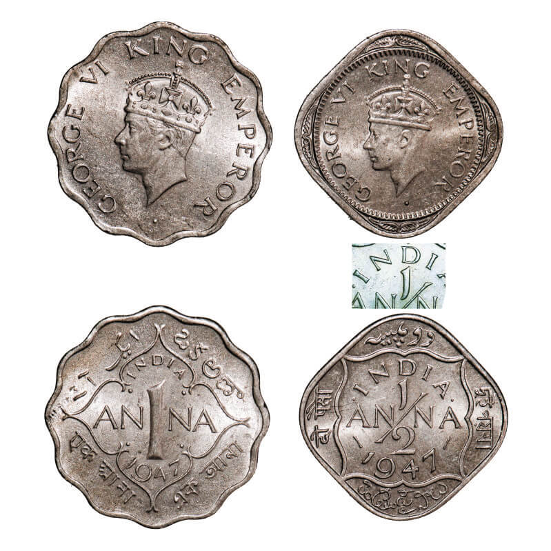 | George VI, Copper-Nickel, (2 coins), 1947, 1) 1 Anna, Calcutta Mint, Head Type II, No dot, Tip of the crown not touching āNā in King, 2) 1/2 Anna, Calcutta Mint, Dots by India, Dashes by year, Tiny Diamond shape pyramid on Rev. F. Prid 970, 989. GK 1403, 1417. Uncirculated to Brilliant Uncirculated. Scarce. |