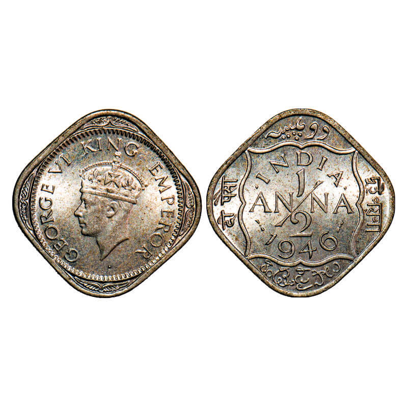 George VI, Copper-Nickel, 1/2 Anna, 1946, Bombay Mint, Dots by India, Dash-Dot-Dash, Tiny Diamond s...