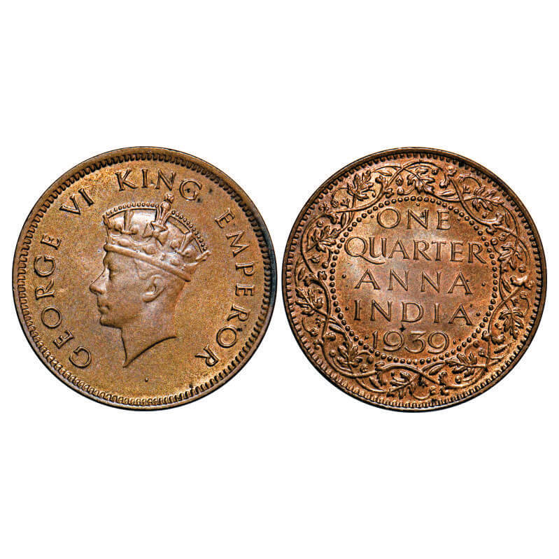 George VI, Bronze, Quarter Anna, 1939, Bombay Mint, Head Type I, Dot. F. Prid 690. GK 1422. Uncirculated. Scarce.