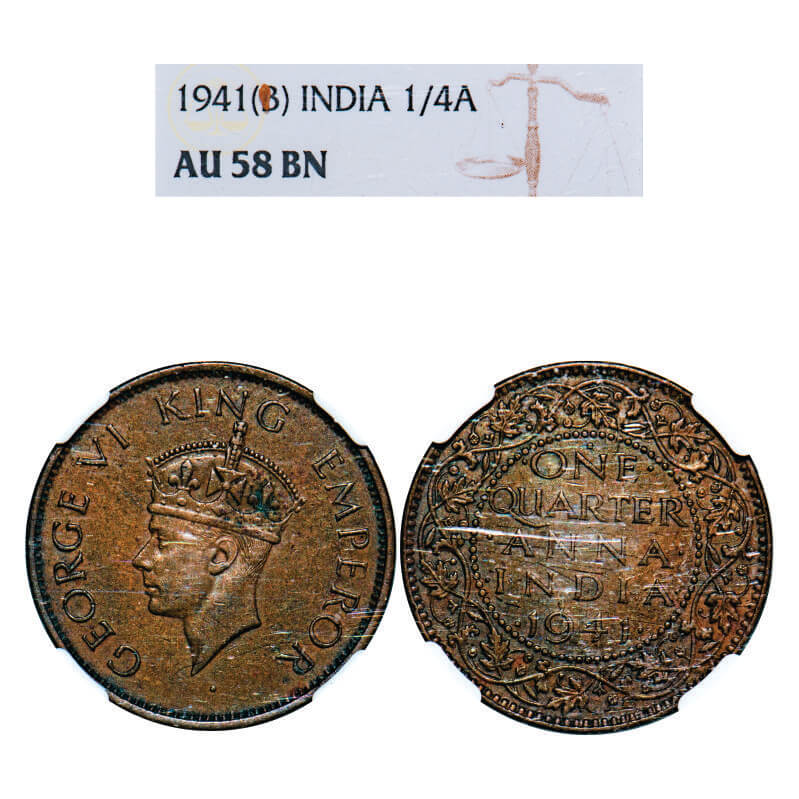 George VI, Bronze, Quarter Anna, 1941, Bombay Mint, Head Type II, Dot. F. Prid 693. GK 1428. NGC Slabbed AU 58. Rare.