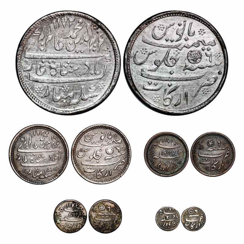 | Madras Presidency, Silver (5 Coins), (1823-1825 AD Issue), Rupee, ½, ¼, 1/8, 1/16 (Rose type), AH 1172/6 RY, Arkat mint, INO Alamgir II. Paul Stevens 4.30, 4.31, 4.33, 4.34, 4.35/F. Prid 263, 264, 265, 266, 267. Very Fine to Very Fine+, Scarce. |