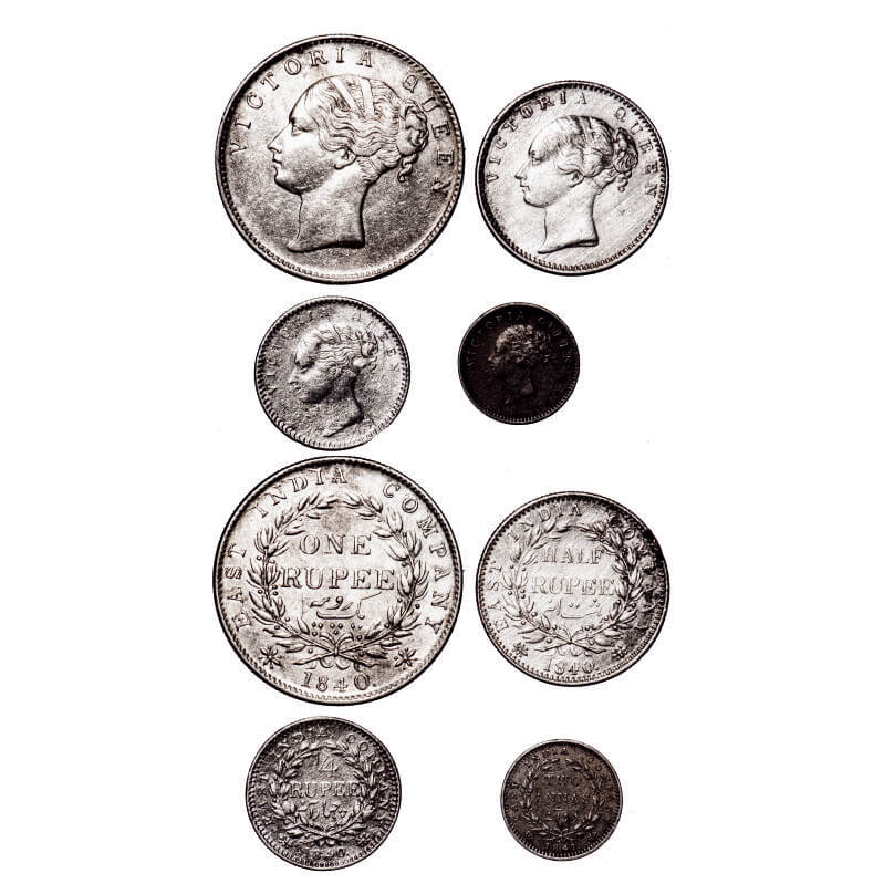 | Victoria Queen, Silver, 1840, CL, (4 coins), 1) Rupee, Calcutta Mint, A/I(i), English Head, With Two leaves above 'O' of One, Crescent on Left ribbon bow, 2) Half Rupee, Bombay Mint, A/I, Wreath with 19 Berries (9L + 10R), With Two leaves above 'F' of Half, 3) 1/4 Rupee, Bombay Mint, A(b)/I, Wreath with 20 Berries (10L + 10R), 4) 2 Annas, 1841, Calcutta Mint, A/I, Plain edge, Crescent on Left ribbon bow, Numeral 4 w/o serif. F. Prid 42, 76, 102, 114. GK 81, 123, 132, 134. Very FIne to About Uncirculated. Scarce. |