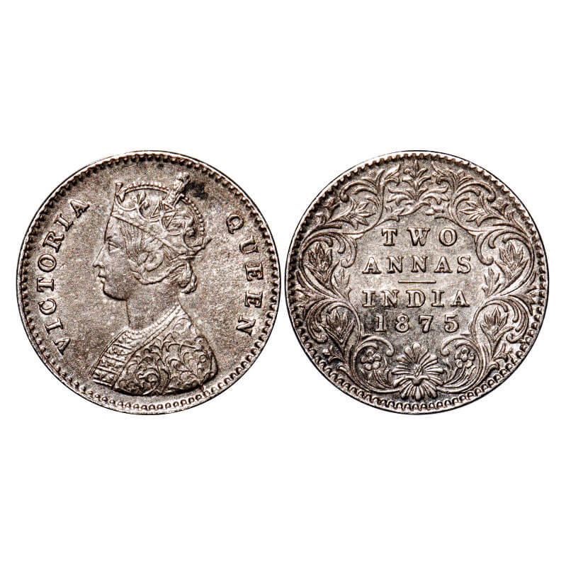 | Victoria Queen, Silver, 2 Annas, 1875, Calcutta Mint, A/I, No mint mark, Die crack on Obv. F. Prid 489. GK 742. About Uncirculated, Toned. Very Scarce. |