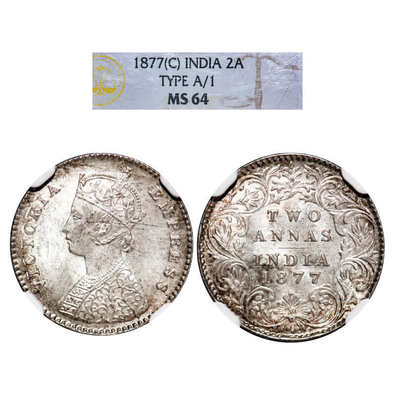 Victoria Empress, Silver, 2 Annas, 1877, Calcutta Mint, A/I, No mint mark. F. Prid 491. GK 748. NGC Slab MS 64. Very Rare.