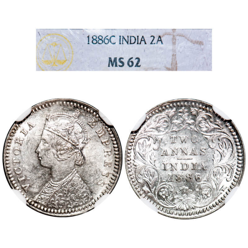 Victoria Empress, Silver, 2 annas, 1886, Calcutta Mint, B/II, 'C' incused. F. Prid 501. GK 782. NGC Slab MS 62. Rare.
