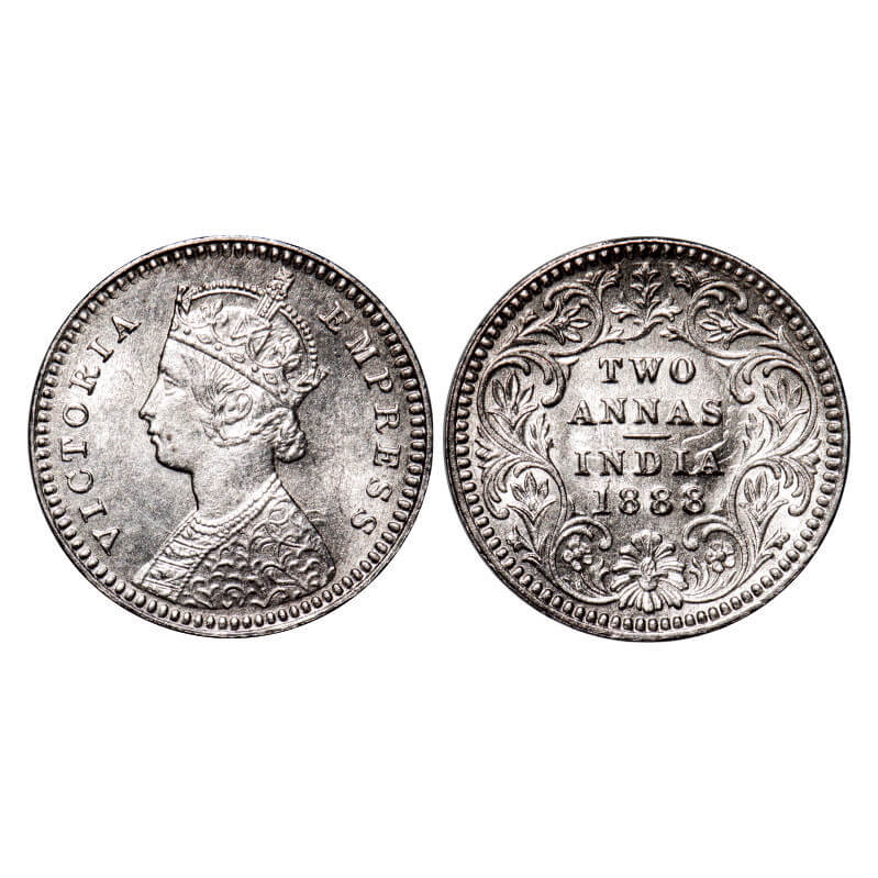 | Victoria Empress, Silver, 2 Annas, 1888, Calcutta Mint, B/II, No mint mark, No 'C', Ghost on Rev. F. Prid 503. GK 786. Mint State. Rare. |