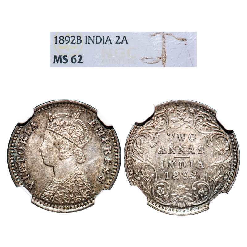 Victoria Empress, Silver, 2 Annas, 1892, Bombay Mint, B/II,'B' incused. F. Prid 547. GK 796. NGC Slab MS 62. Rare.