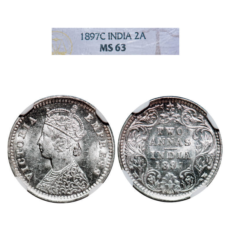 Victoria Empress, Silver, 2 Annas, 1897, Bombay Mint, B/II, 'B' incused, The slab mentions Calcutta Mint but it is a Bombay Mint coin. F. Prid 551. GK 806. NGC Slab MS 63. Rare.