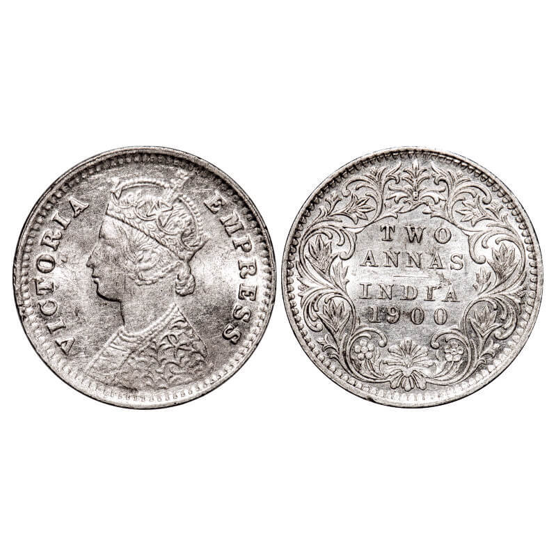 Victoria Empress, Silver, 2 Annas, 1900, Bombay Mint, B/I, 'B' raised, Die crack on Obv. F. Prid 553. GK 812. Almost Uncirculated. Very Scarce.