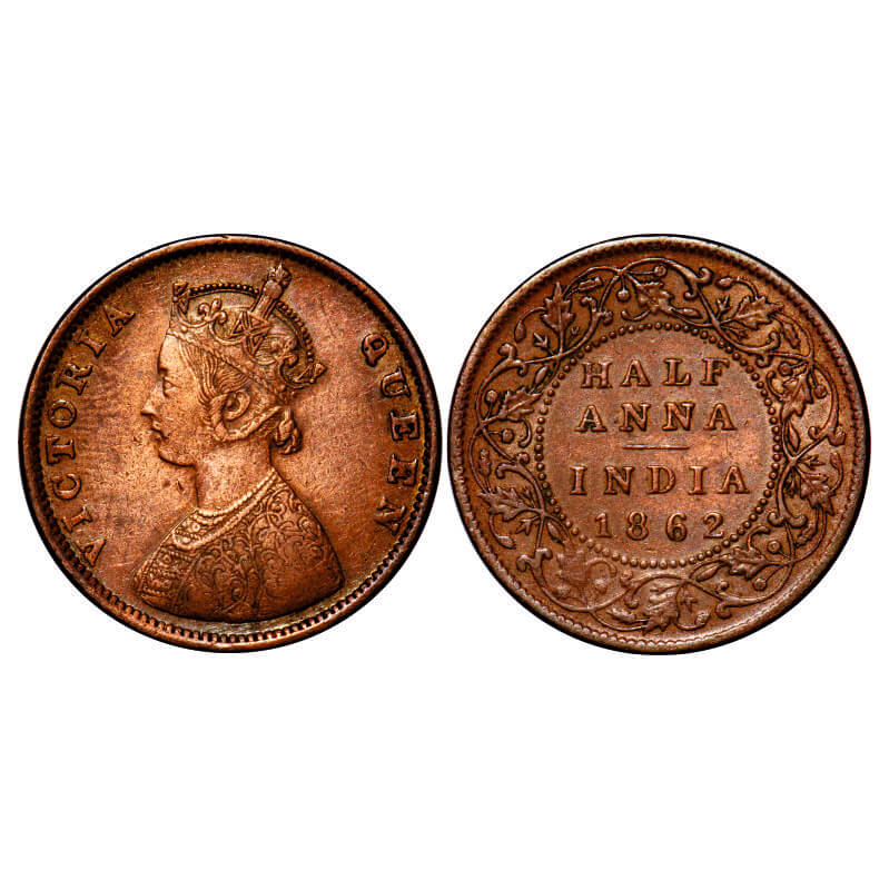 Victoria Queen, Copper, Half Anna, 1862, Madras Mint, A/I(i), Flowers with 5 dots around a centre dot, Inclined top numeral 1. F. Prid 577. GK 391. Very Fine. Scarce.