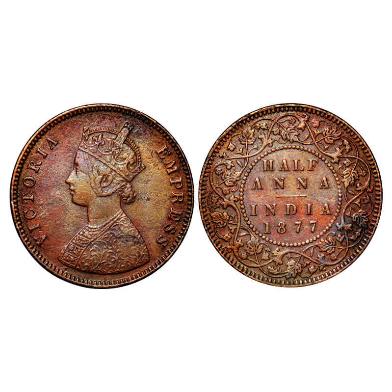 Victoria Empress, Copper, Half Anna, 1877, Bombay Mint, B/II, Flat numeral top 1. F. Prid 586. GK 820. Extremely Fine. Scarce.