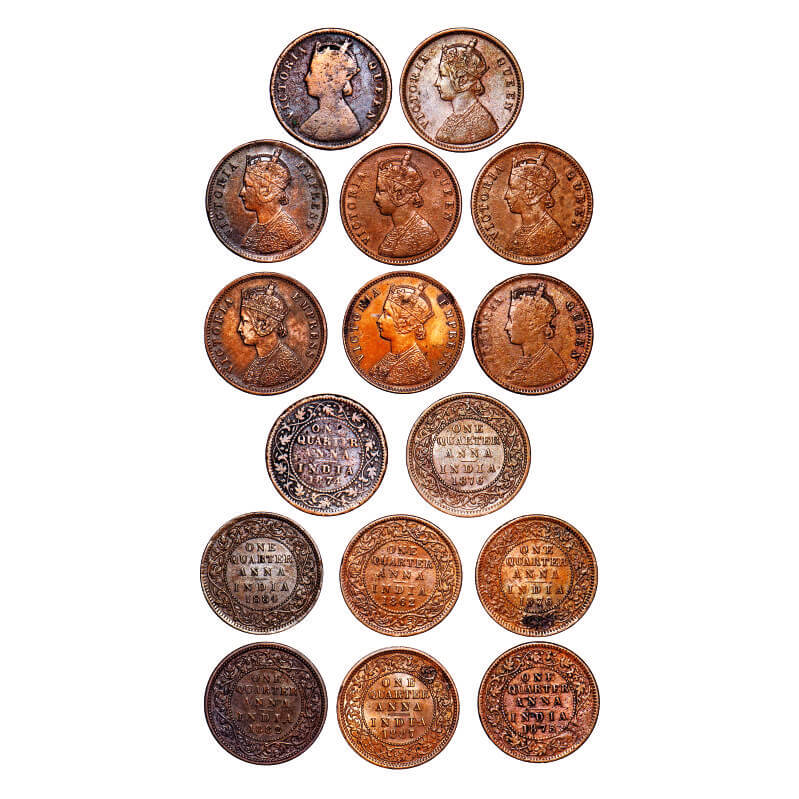 | Victoria Queen & Empress, Copper, Quarter Anna, (lot of 8 coins), 1862, 1874, 1875, 1876, 1876, 1882, 1884, 1887, Bombay and Calcutta Mint. F. Prid 602, 608, 609, 636, 610, 638, 640, 620. GK 397, 823, 825, 826, 827, 834, 838, 844. Fine+ to about Uncirculated. Scarce as a lot. |