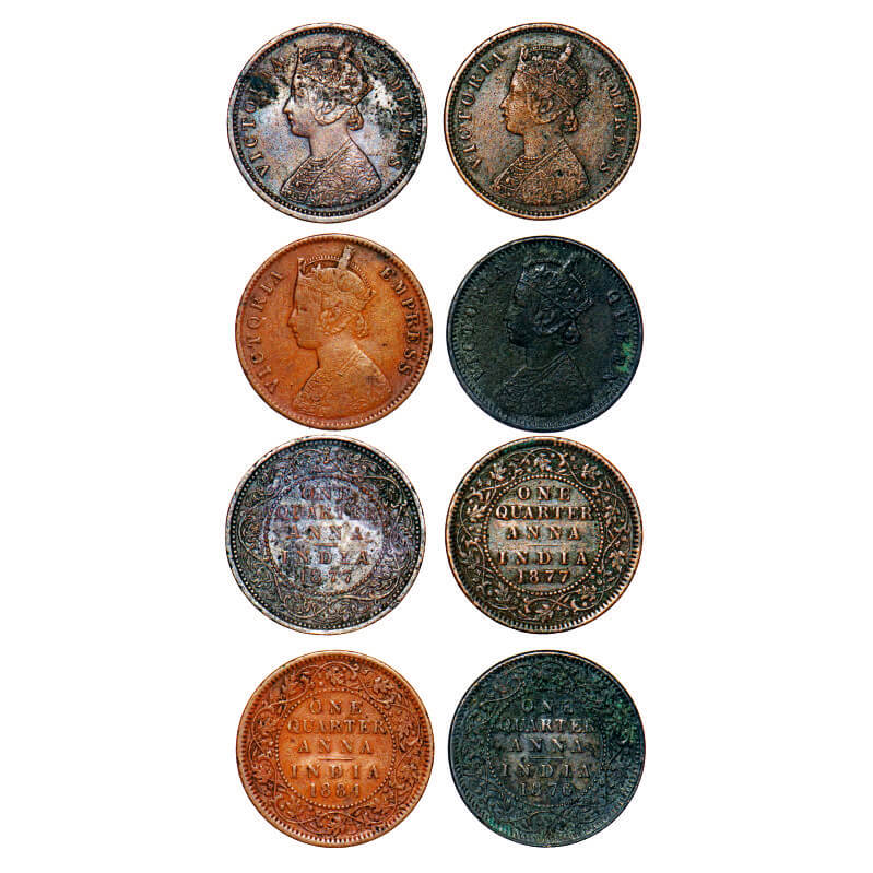 | Victoria Queen & Empress, Copper, Quarter Anna, (4 coins), 1) 1876, Calcutta mint, B/II, No mint mark, 2) 1877, Bombay Mint, B/I, No mint mark, 3) 1877, Calcutta mint, B/II, No mint mark, 4) 1884, Calcutta mInt, B/II, 'C' incused. GK 827, 828, 829, 839. Fine+ to Very Fine. Scarce as a lot. |