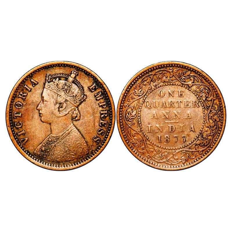 Victoria Empress, Copper, Quarter Anna, 1877, Bombay Mint, B/I, No mint mark. F. Prid 637. GK 828. Very Fine+. Scarce.