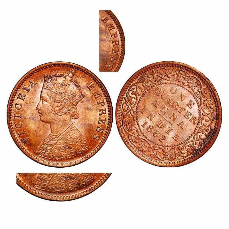 | Victoria Empress, Copper, Quarter Anna, 1882, Calcutta Mint, B/II, 'C' incused, Multiple die crack on Obv, 1'o clock on Rev. F. Prid 615. GK 835. Uncirculated. Rare. |