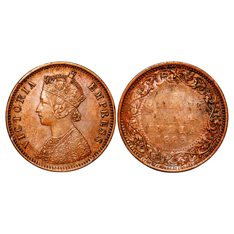 | Victoria Empress, Copper, Quarter Anna, 1883, Bombay Mint, B/I, No mint mark, Error, Die filled ONE QUARTER ANNA INDIA year within beaded circle on Rev. F. Prid 639. GK 836. Extremely Fine. Very Scarce. |