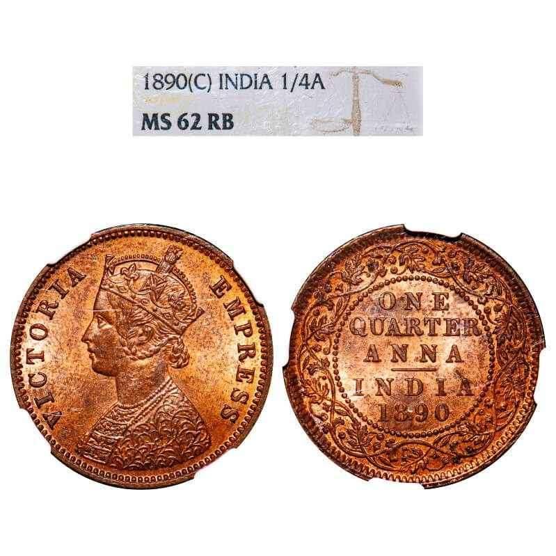 Victoria Empress, Copper, Quarter Anna, 1890, Calcutta Mint, B/II, No mint mark. F. Prid 623. GK 849. NGC Slab MS 62 RB. Rare.