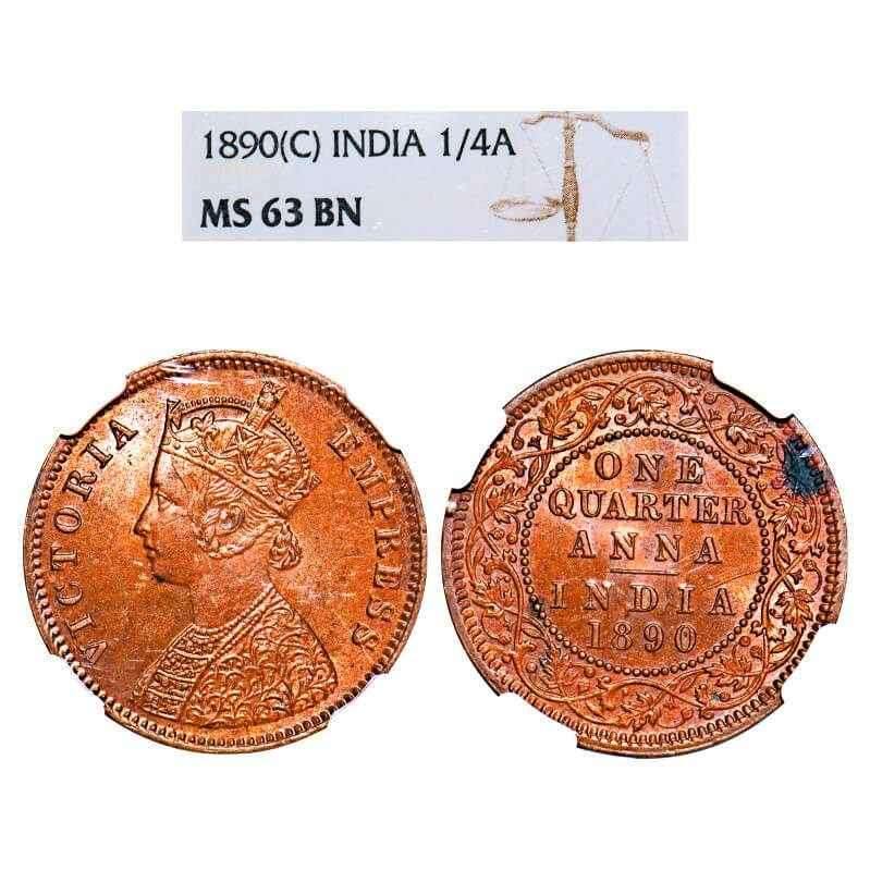 Victoria Empress, Copper, Quarter Anna, 1890, Calcutta Mint, B/II, No mint mark. F. Prid 623. GK 849. NGC Slab MS 63 BN. Rare.