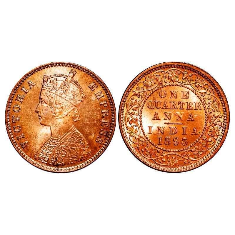 Victoria Empress, Copper, Quarter Anna, 1893, Calcutta Mint, B/II, No mint mark, Die crack on Rev. F. Prid 626. GK 852. Mint State. Rare.