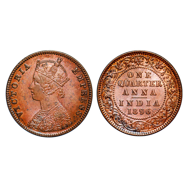 Victoria Empress, Copper, Quarter Anna, 1896, Calcutta Mint, B/II, No mint mark, Ghost on Rev. F. Prid 629. GK 855. Uncirculated. Very Scarce.