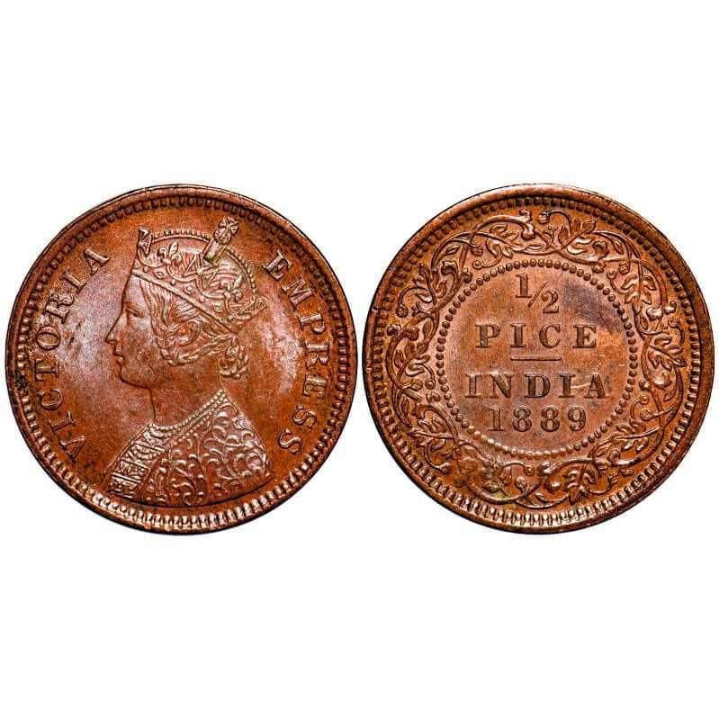 Victoria Empress, Copper, 1/2 Pice, 1889, Calcutta Mint, A/I, No mint mark, Ghost on Rev. F. Prid 721. GK 869. Uncirculated. Very Scarce.