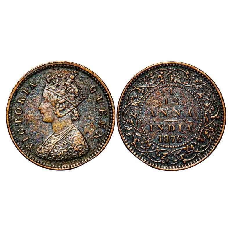 Victoria Queen, Copper, 1/12 Anna, 1876, Calcutta Mint, Obv A, No mint mark. F. Prid 785. GK 888. Extremely Fine+. Scarce.
