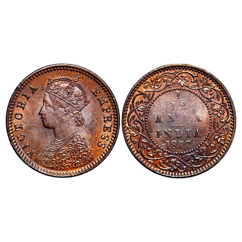 Victoria Empress, Copper, 1/12 Anna, 1877, Calcutta Mint, Obv B, No mint mark. F. Prid 786. GK 890. About Uncirculated. Very Scarce.