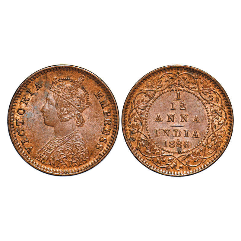 Victoria Empress, Copper, 1/12 Anna, 1886, Calcutta Mint, Obv B, 'C' incused. F. Prid 791. GK 902. Uncirculated, Details. Scarce.