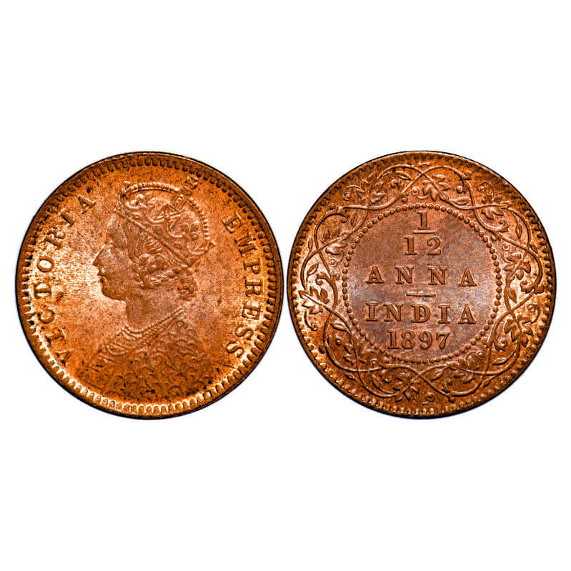 Victoria Empress, Copper, 1/12 Anna, 1897, Calcutta Mint, Obv B, No mint mark. F. Prid 802. GK 918. Uncirculated. Scarce.