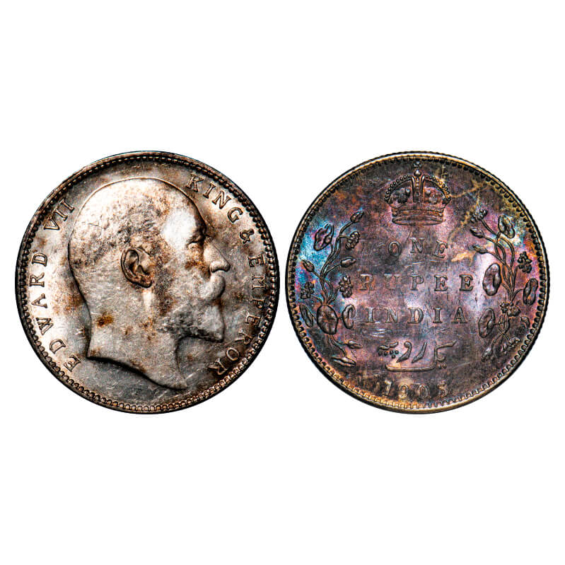 Edward VII, Silver, Rupee, 1903, Bombay Mint, 'B' incused and dot, Ghost on Rev, Rainbow toned Rev. F. Prid 199. GK 926. Uncirculated. Very Scarce.