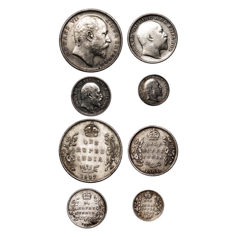 | Edward VII, Silver, 1907, (4 coins), 1) Rupee, Bombay Mint, 'B' incused and dot, 2) Half Rupee, Bombay Mint, 'B' incused, No dot, 3) 1/4 Rupee, Calcutta Mint, No mint mark, 2 Annas, Calcutta Mint, No mint mark. F. Prid 203, 316, 436, 560. GK 944, 965, 976, 984. Very FIne to Extremely Fine+. Scarce. |