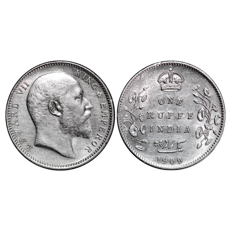 Edward VII, Silver, Rupee, 1909, Calcutta Mint, No mint mark. F. Prid 195. GK 950. About Uncirculated. Very Scarce.