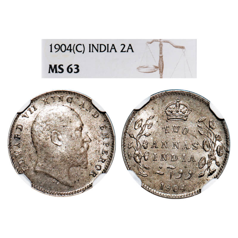 Edward VII, Silver, 2 Annas, 1904, Calcutta Mint, No mint mark. F. Prid 557. GK 981. NGC Slab MS 63. Rare.
