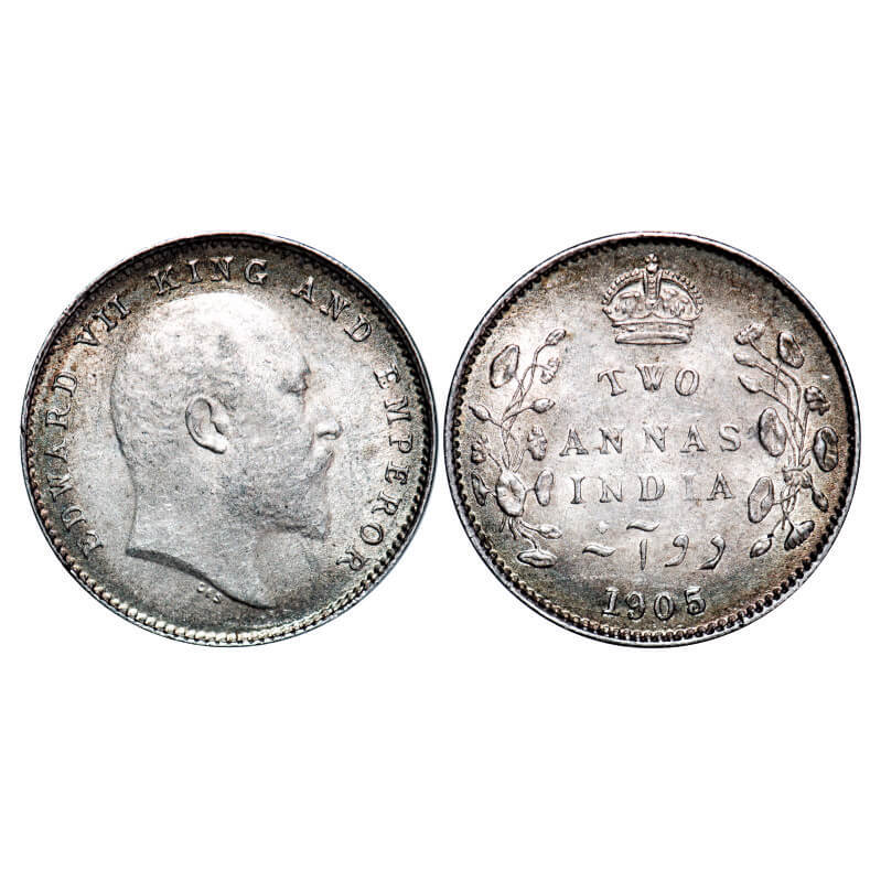 Edward VII, Silver, 2 Annas, 1905, Calcutta Mint, No mint mark. F. Prid 558. GK 982. About Uncirculated. Scarce.