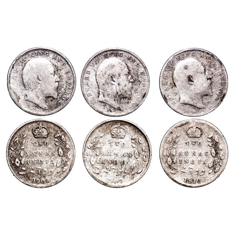 | Edward VII, Silver, 2 annas (3 coins), 1905, 1907, 1910, Calcutta Mint, No mint mark. F, Prid 558, 560, 563. GK 982, 984, 987. Fine+ to Very Fine+. Scarce. |